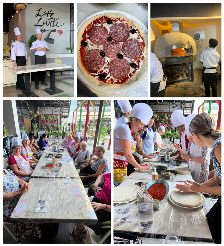 First things first, we donned our chefs hats and aprons and listened to Guiseppe and Geualdo… two Italian chefs from Sicily. They spoke to us about the benefits of eating local produce seasonally. Then we were given our own plates with pre-prepared dough. We were shown how to knead the air out of the dough and then top it with tomato sauce and our choice of mushrooms, olives, salami and mozzarella cheese. Thereafter, all that remained was to have our ‘masterpieces’ cooked in the pizza oven. This took only 5 to 10 mins. The aroma in the vicinity was delicious… we were all feeling hungry. Finally our pizzas were served and they were delicious! It was a thoroughly enjoyable morning with lots of banter, happy faces and stomachs.