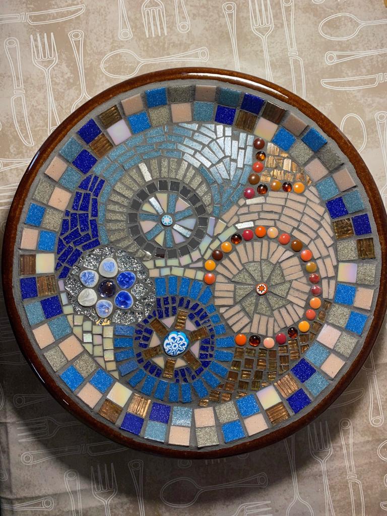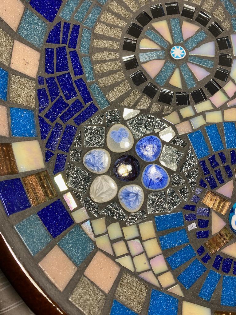 Members of the Mosaics Circle are completing projects at home. Karen recently finished this beautiful mosaic bird bath.
