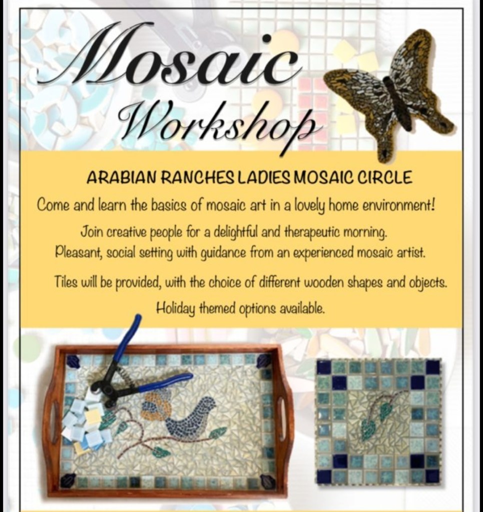 The Mosaics Circle, led by Ayesha, will restart on Wednesdays from 10am – 1pm, from 10 Nov if there are enough ladies, in Green Community East, DIP.