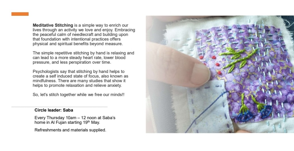 The new Meditative Stitching Circle, led by Saba, are meeting on Thursdays from 10am to 12pm.