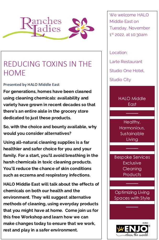 HALO Middle East will give a talk on reducing toxins in the home. You can also learn about Enjo’s fast, efficient and environmentally friendly cleaning products. https://www.enjo.com/ae
