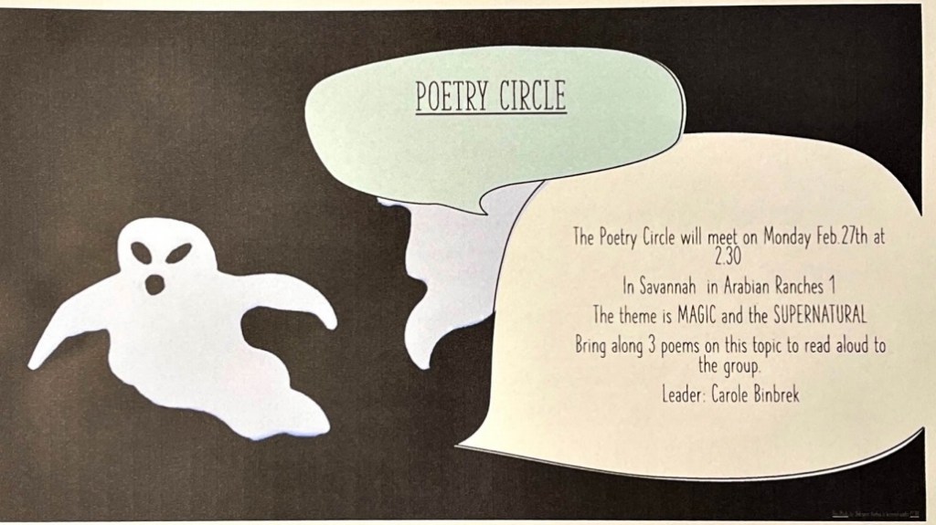 The next Poetry Circle meeting is planned for Monday 27th February, 2.30pm, on the theme of Magic and the Supernatural.