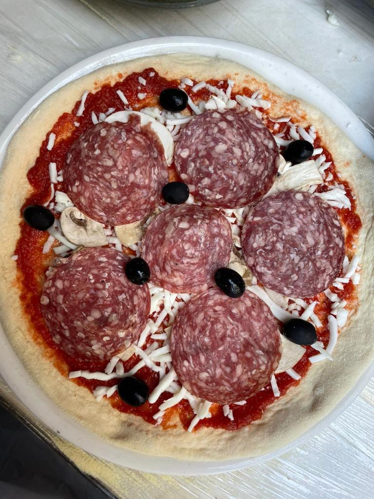 See link for a recipe to make pizza at home: https://www.simplyrecipes.com/recipes/homemade_pizza/