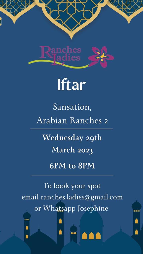 Ranches Ladies is organising an Iftar for all Ranches Ladies members on Wednesday, March 29, 6pm at Sansation Restaurant in Arabian Ranches 2.