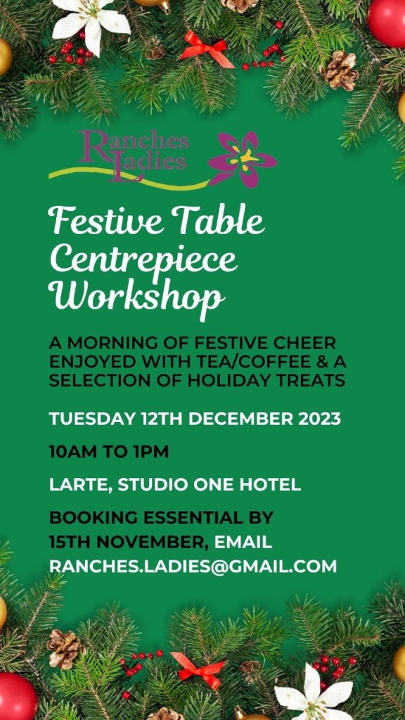 Book now for the Festive Table Centrepiece Workshop on Tuesday 12th December. Speak to Josephine McBurney, email ranches.ladies@gmail.com, or see more information on the RL members WhatsApp group.