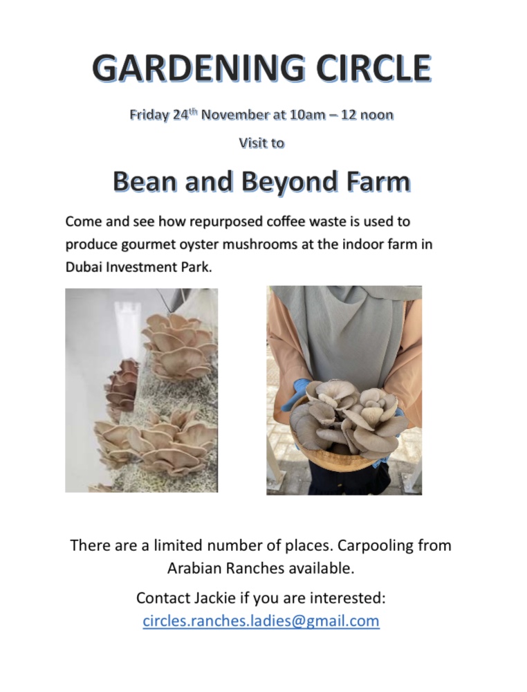 The Gardening Circle have a trip planned to Bean & Beyond Farm in DIP, on Friday 24th November at 10am. They will be learning how they are using waste coffee grounds to grow oyster mushrooms.