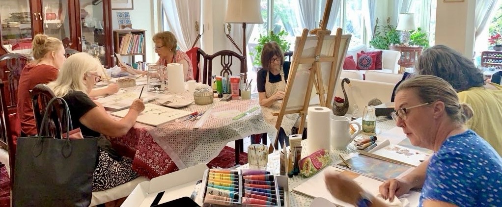 The Art Circle had a wonderful class last week. Carole hosted it & it was lovely to see her Art Gallery which is the outcome of her hard work. We started a class project, ‘Thatched Cottage in the Woods’ by Thomas Kinkade. It was interesting to see everyone working with their own distinctive style on a common theme.