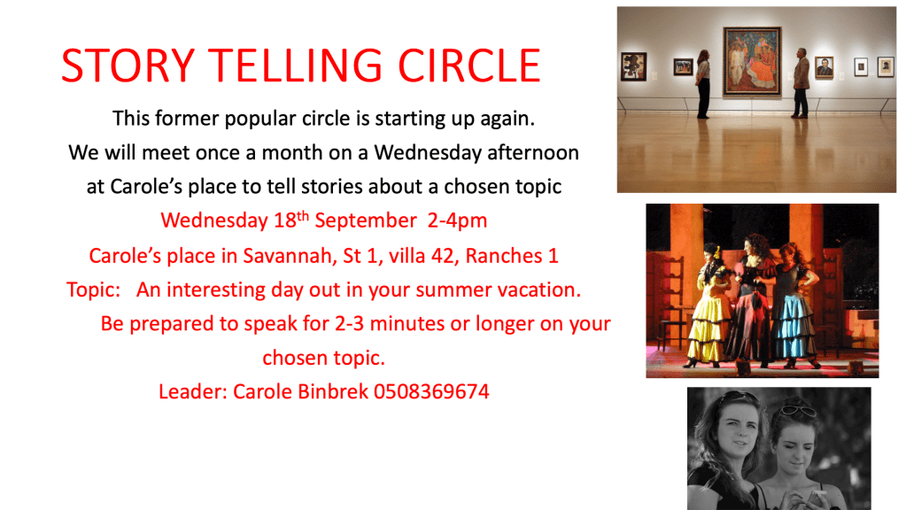 The Storytelling Circle plan to meet on Wednesday 18th Sept, 2pm in Savannah, AR1. The theme will be ’An interesting day out during my vacation.’