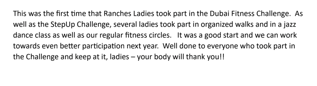 Pascale from Optimal Fitness. kindly offered Ranches Ladies a free taster Jazz Dance class on Tuesday as part of Dubai Fitness month. We all enjoyed learning some new moves. Pascale is a wonderful teacher who also teaches ballet to ladies and children and salsa to adults.