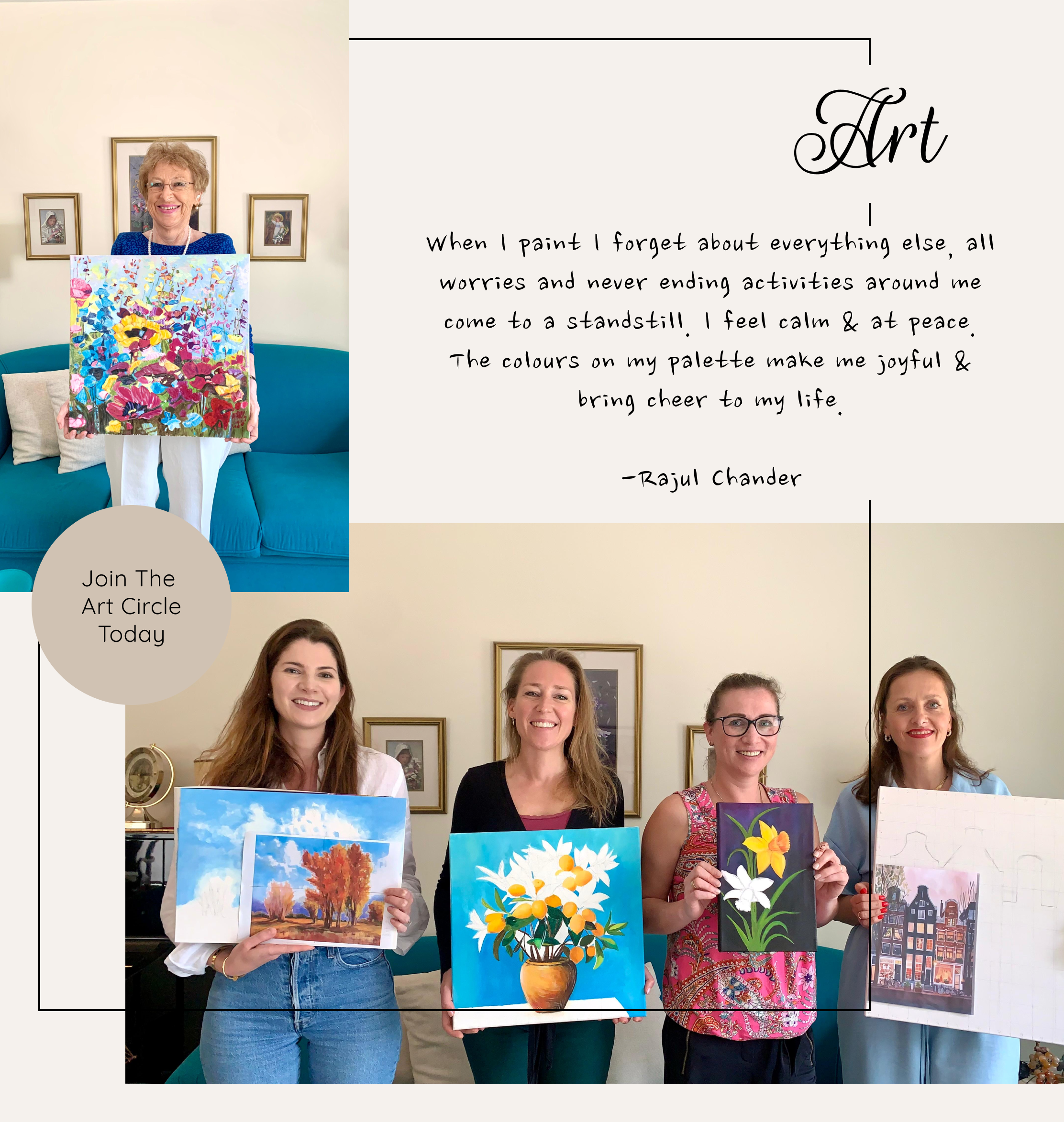 Ladies in the Art circle are working on varied themes making some beautiful paintings. If you like painting, do come and join our Circle. The Art Circle Art circle, led by Rajul, on meet on Mondays (Beginners) and Thursdays (Regular students) from 10:00 am to 12:00 pm in Arabian Ranches 1.