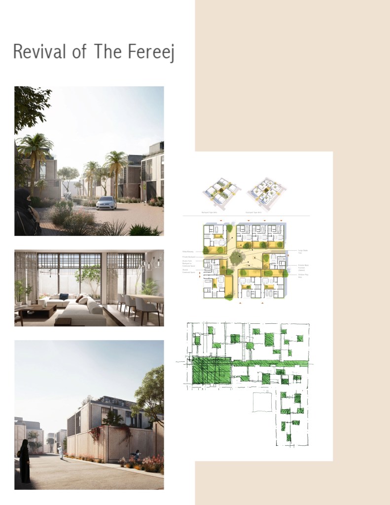 Fareej, refers to a traditional Emirati Arabic term for neighbourhood and this cultural heritage emphasizes social cohesion and community identity providing a sense of place, interconnectedness and communal spaces.