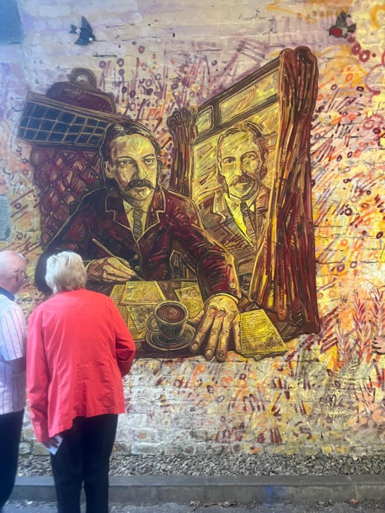 Robert Louis Stevenson who wrote Kidnapped and Treasure Island was born and brought up in Edinburgh. Yesterday I walked through this old railway tunnel near Swanston where he lived as a child. It is painted with murals showing scenes from his poem ‘From a Railway Carriage printed in blue on the poster. Several artists and schools took part in painting the tunnel. The last scene shows people living in the area. Most Scottish school children learned the poem by heart.