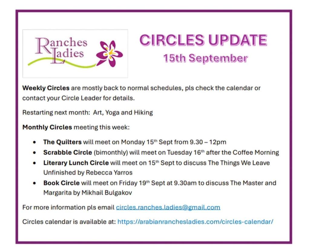 Email circles.ranches.ladies@gmail.com if you would like to join any circle. If you are a member but not yet on the members only Ranches Ladies Whatsapp group please email ranches.ladies@gmail.com