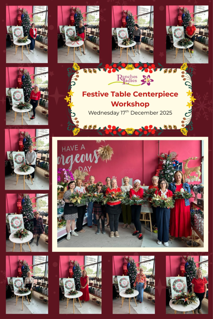 It was another very enjoyable morning at our Ranches Ladies Festive Table Centrepiece Event which has been held each year over the past four years collaborating with florists “Gorgeous Flowers” based in Motor City.