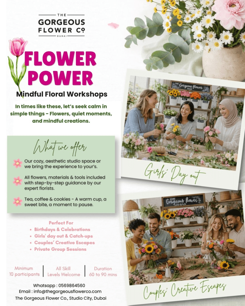 The Gorgeous Flower Co. are organising these workshops. If ladies would like to attend, their prices start from 200 aed per head with a special 10% discount for Ranches Ladies.