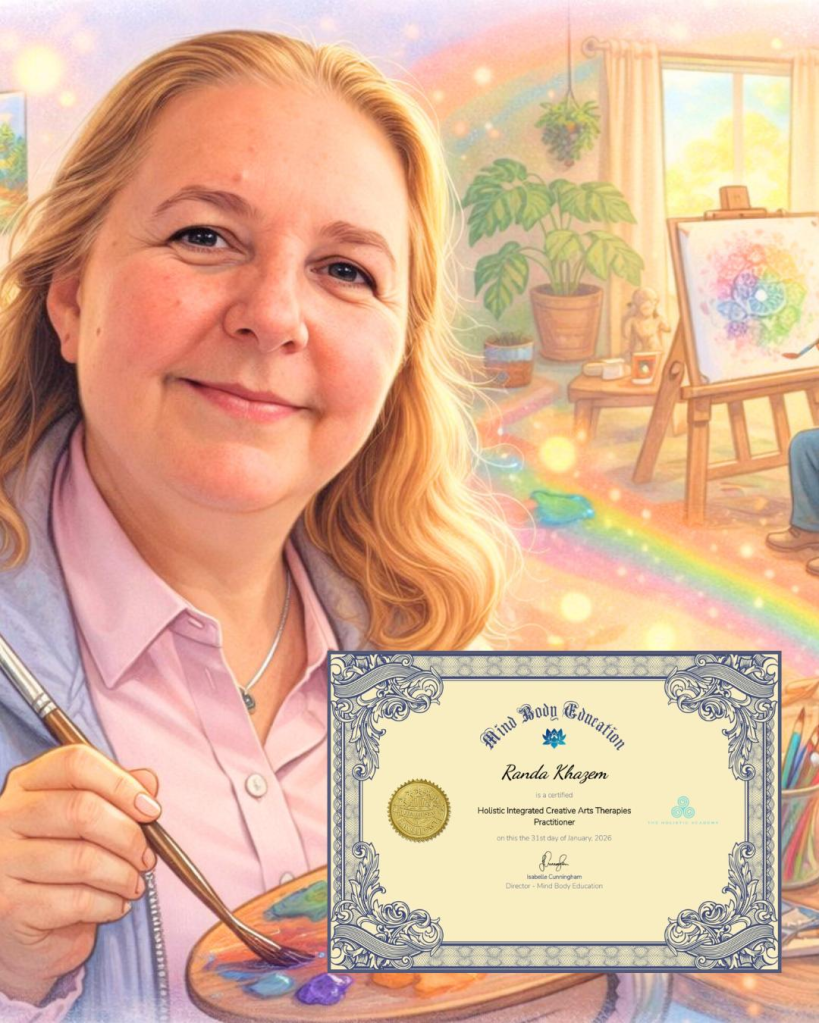 Congratulations to our Decoupage Circle leader, Randa Khazim, who recently qualified as a certified Holistic Integrated Arts Therapies Practitioner. Randa put a huge amount of work and effort into this demanding course and her success was well deserved!